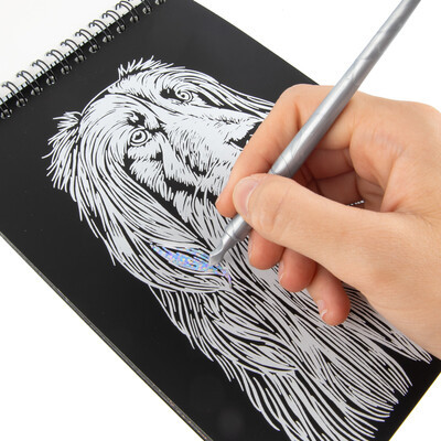 Гравюра-блокнот с разнообразными рисунками на страницах и специальным пластиковым штихелем для создания красочных работ.