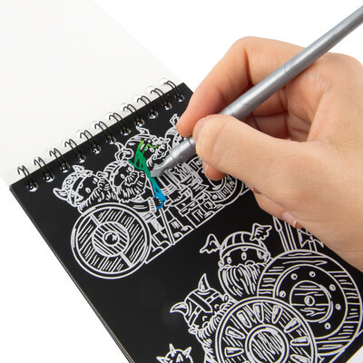 Гравюра-блокнот с разнообразными рисунками на страницах и специальным пластиковым штихелем для создания красочных работ.